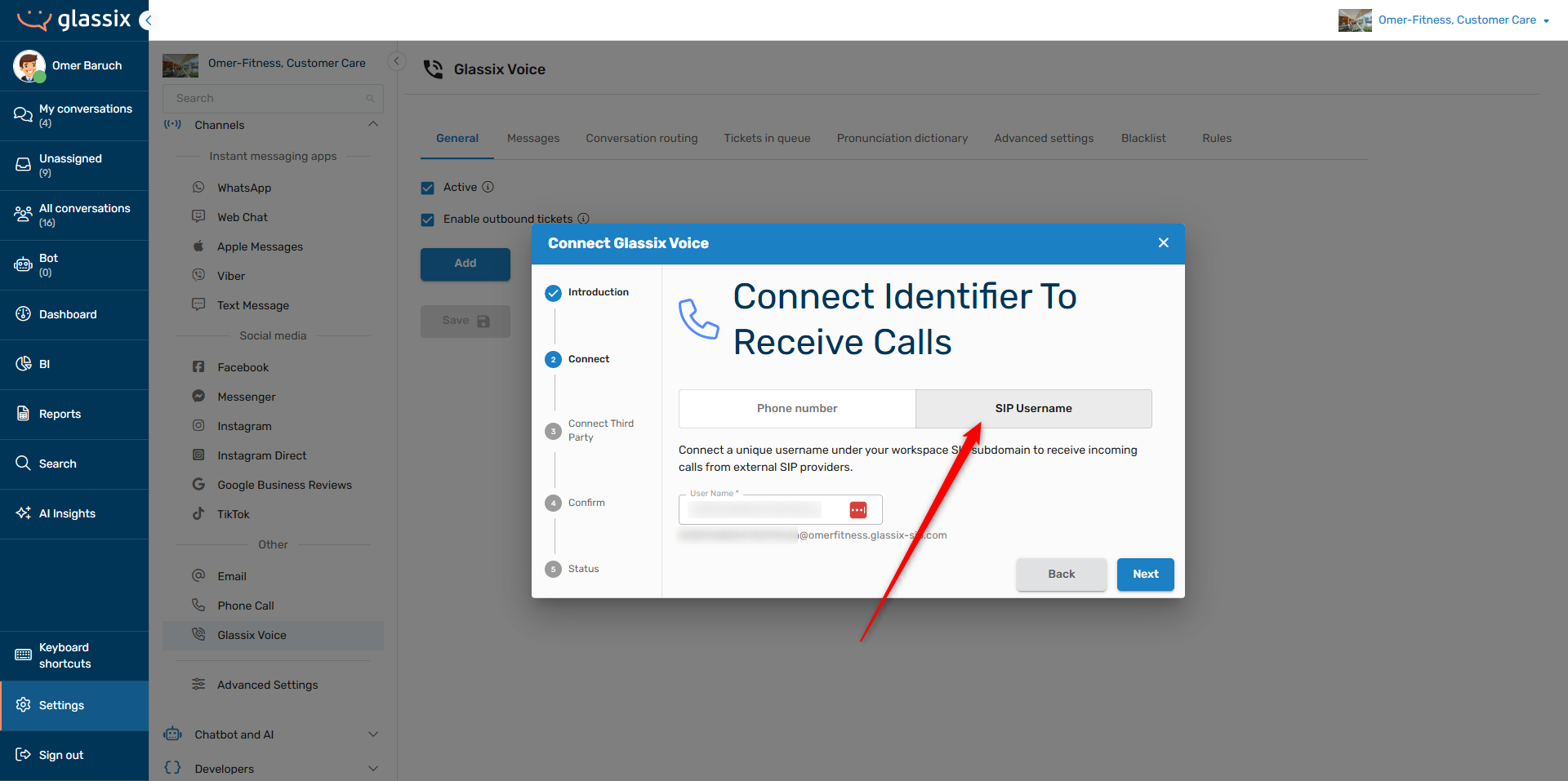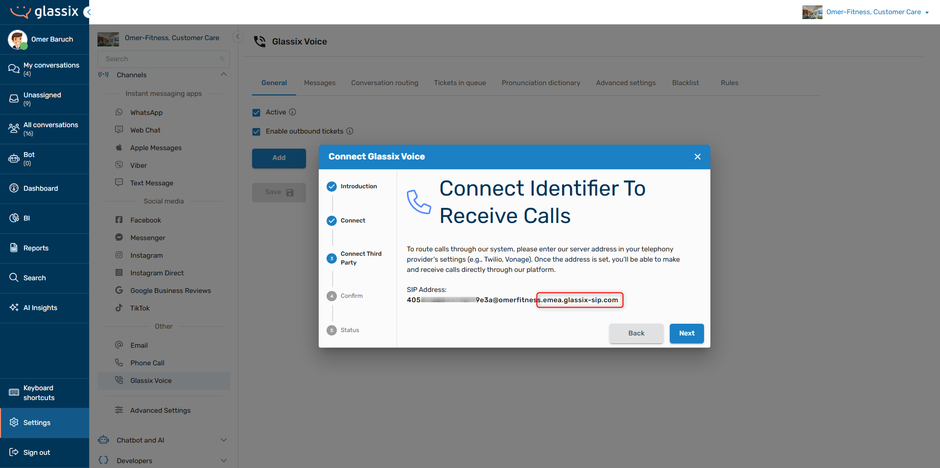 Click here or navigate to Settings → Channels → Glassix Voice: