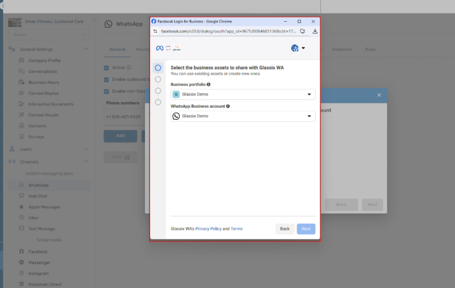 You will be asked to grant Glassix permission to manage your WhatsApp account and billing information. Click through to proceed.