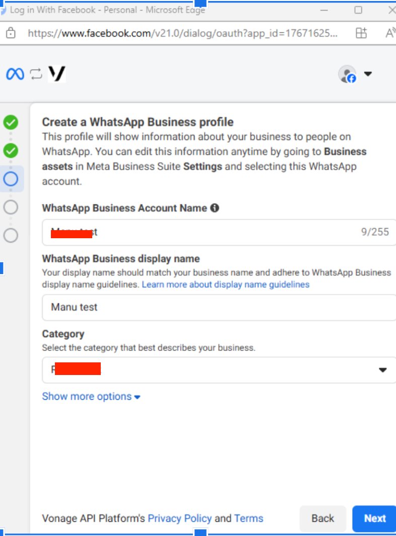 Select "Create WhatsApp for Business Account" and fill in the following: