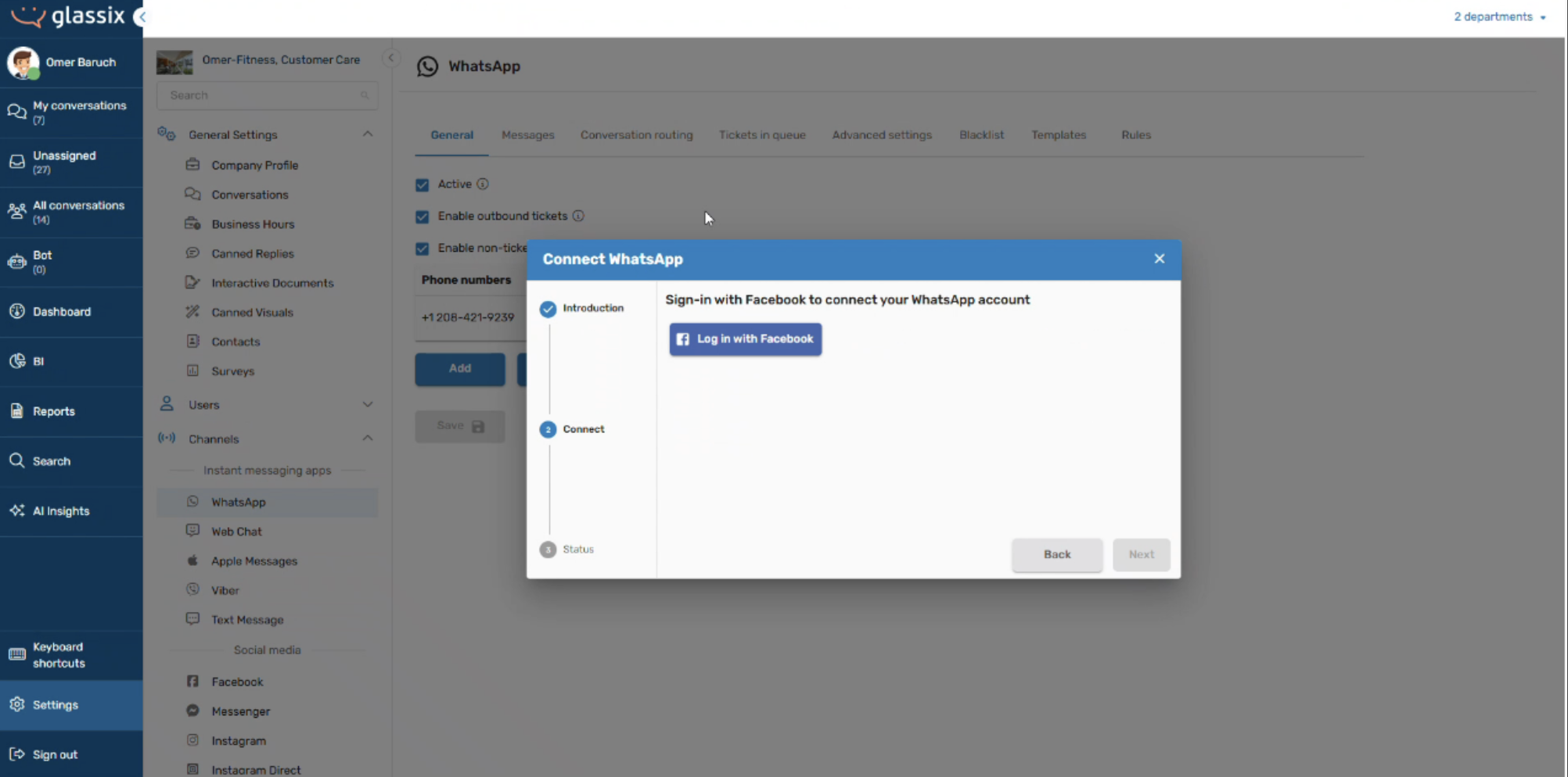 Before you begin, you must contact your Glassix contact or implementation partner. We will provide you with the link needed to start this process. Connecting a WhatsApp number is not available by default because it requires billing setup on our end.