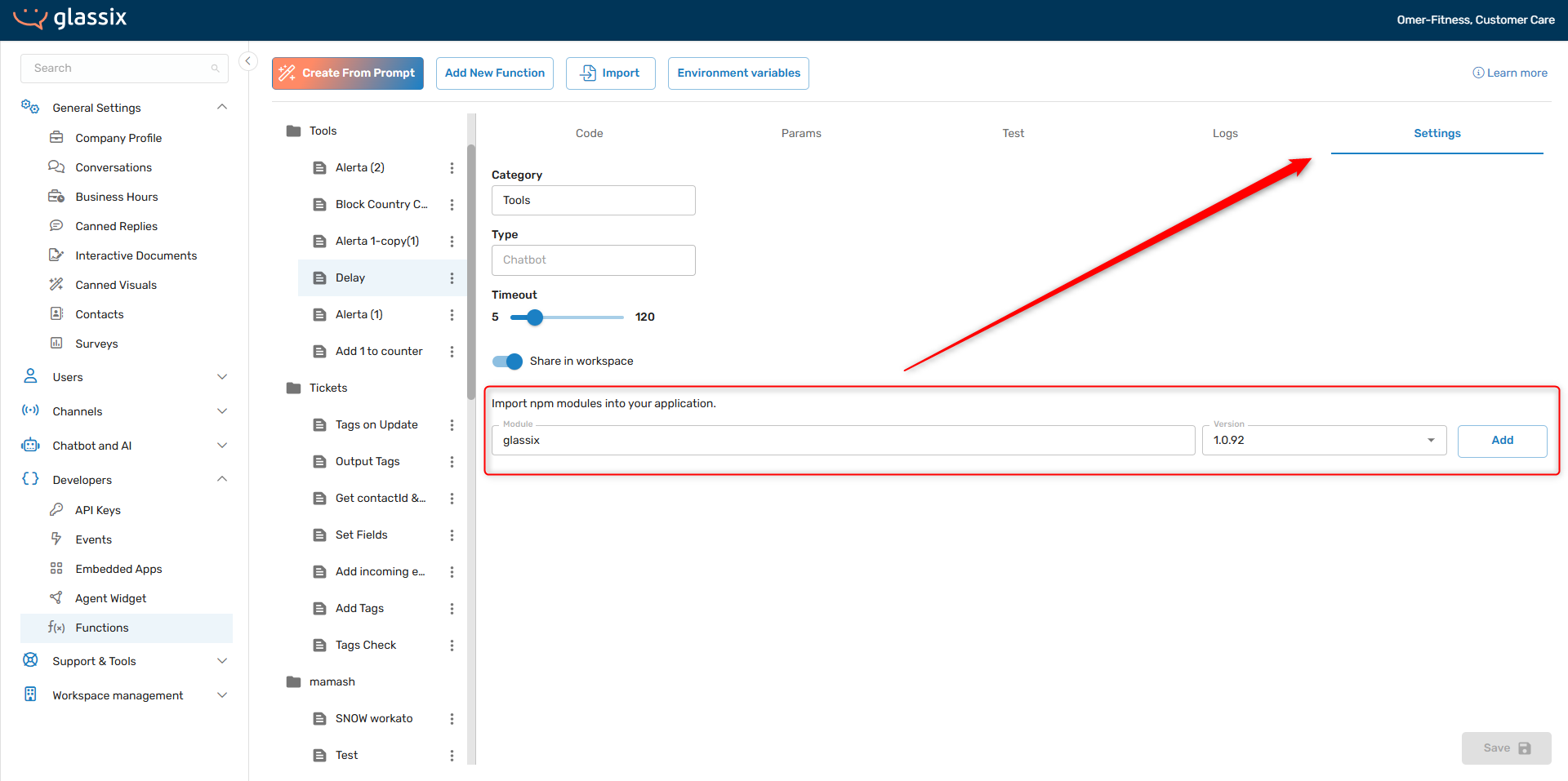 const glassix = require('glassix');If you're using our JavaScript SDK with one of your Glassix functions, make sure to import it as a module when creating the function. This will handle both the installation and the import for you automatically: