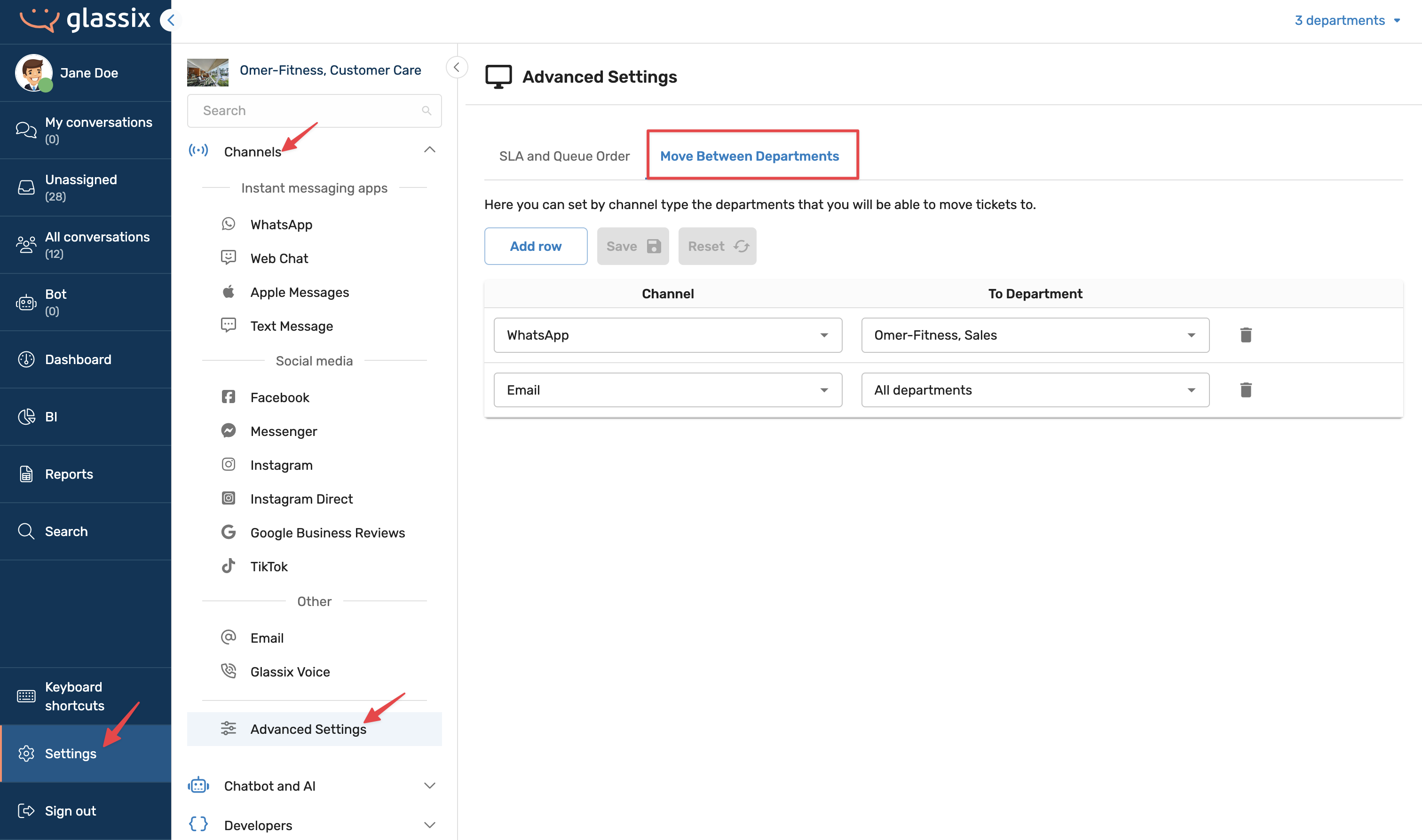 - Click Channels → Advanced Settings → Move Between Departments