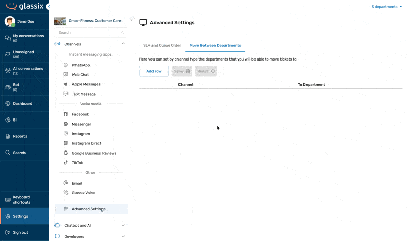 The Move Between Departments feature controls which channels can transfer tickets between departments. This setting applies to both agent-initiated transfers and automated bot flows. This setting allows you to prevent departments from transferring tickets to one another, ensuring sensitive information stays within the appropriate team and maintaining data privacy.