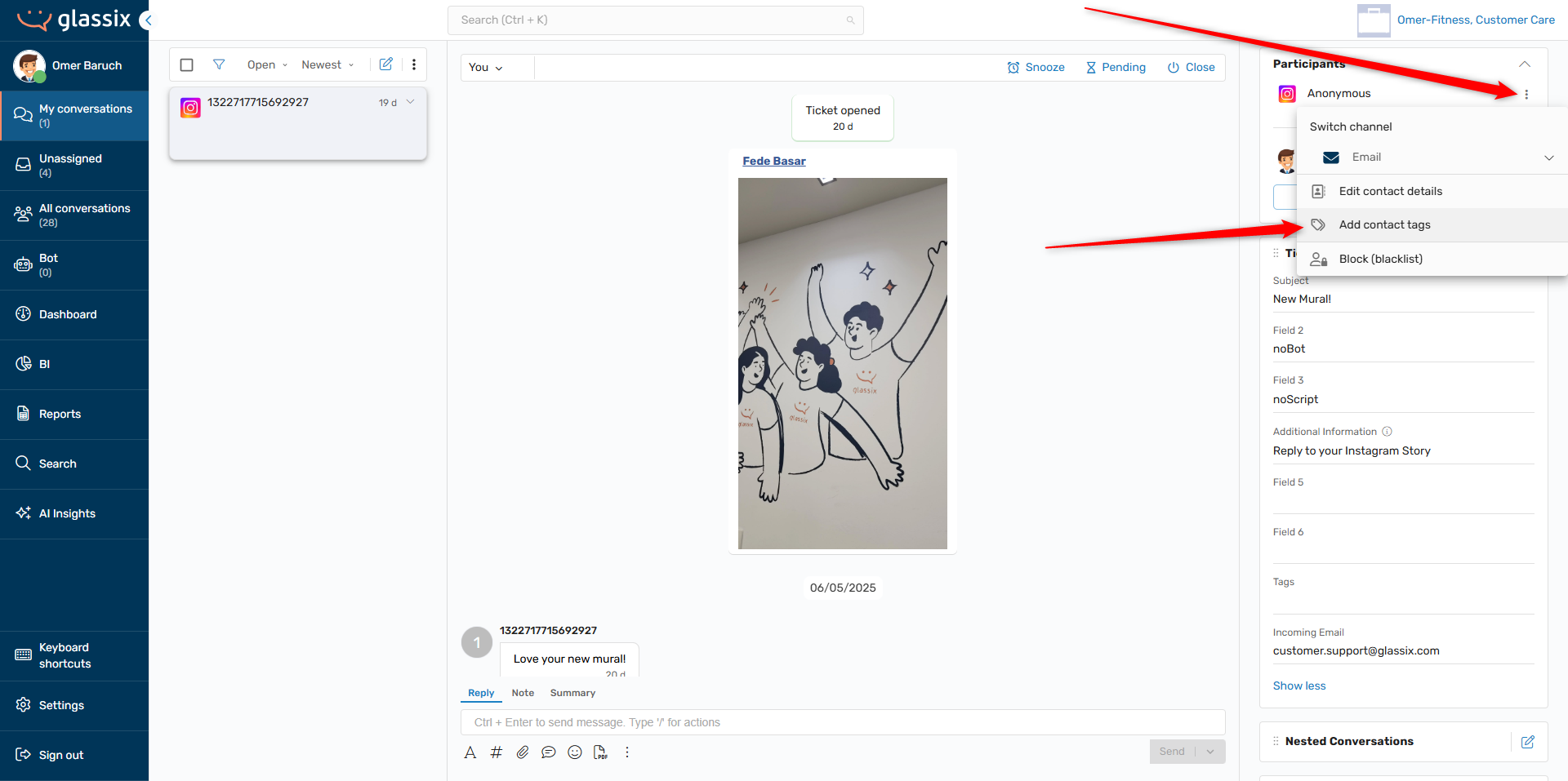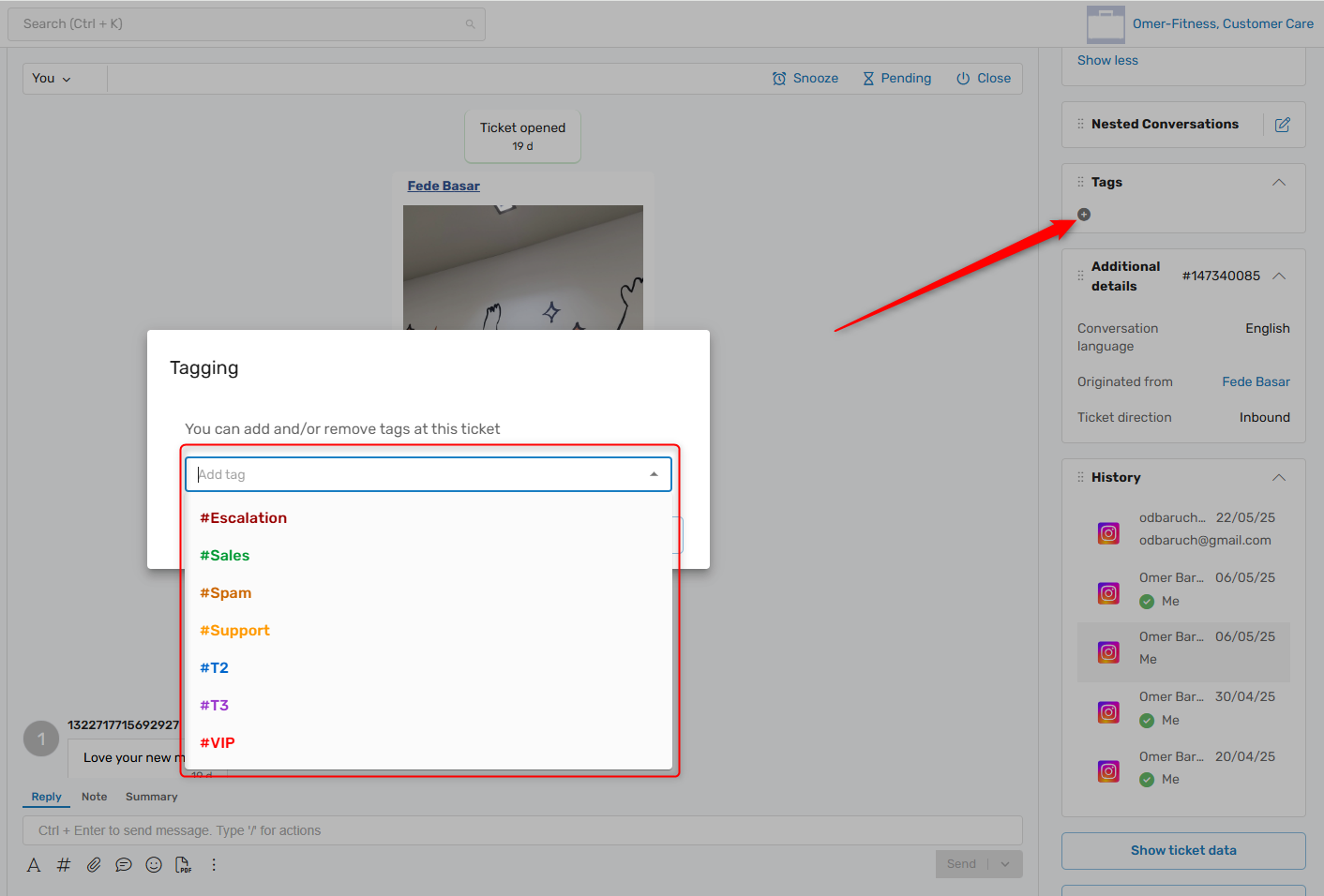 Open any conversation with the contact for whom you want to add a tag (including closed tickets):